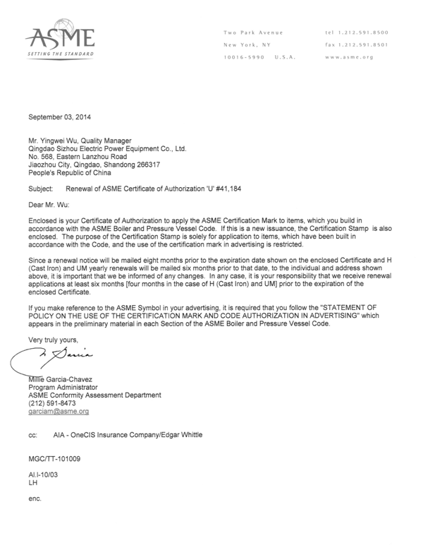 2014年7月17日至18日,?ASME審核組對我公司進行為期兩天的換證審核工作。ASME審核通過對我公司以往ASME產(chǎn)品的資料的審查;對設計、焊接、探傷、原材料檢驗、現(xiàn)場示范產(chǎn)品的演示、倉庫及標識移植等各個環(huán)節(jié)相關人員的審核,作業(yè)程序抽查和現(xiàn)場抽樣的審核,ASME審核組對我們公司的ASME體系運行給予高度評價,認為我公司完全具備設計和制造ASME規(guī)范要求的產(chǎn)品的能力,此次換證審核順利通過。 |